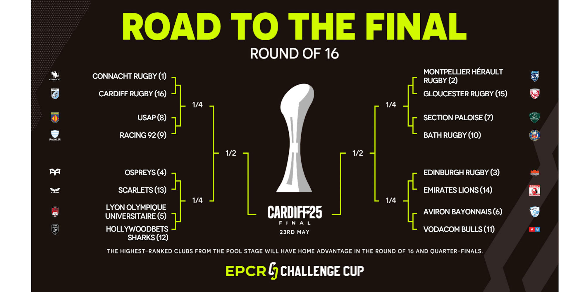 EPCR confirmed the dates, venues, kick-off times and TV coverage of the Challenge Cup Round of 16 fixtures on Wednesday.
