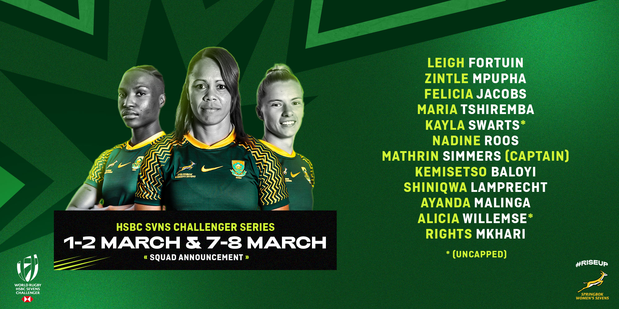 Springbok Women training camp squad: Azisa Mkiva, Luchell Hanekom, Nolusindiso Booi, Nomsa Mokwai, Roseline Botes, Logan Welman (all DHL Western Province); Aphiwe Ngwevu, Eloise Webb, Nombuyekezo Mdliki (all Border), Anathi Qolo, Byrhandrѐ Dolf, Patience Mokone, Dineo Ndhlovu, Libbie Janse van Rensburg, Faith Tshauke, Jakkie Cilliers, Lerato Makua, Micke Gunter, Sanelisiwe Charlie, Sizophila Solontsi, Unam Tose, Yonela Ngxingolo (all Bulls Daisies); Mary Zulu, Tayla Kinsey (both Sharks Women); Aseza Hele, Veroeshka Grain, Nomawethu Mabenge, Maceala Samboya (all Sanlam Boland Dames); Catha Jacobs (Leicester Tigers Women).