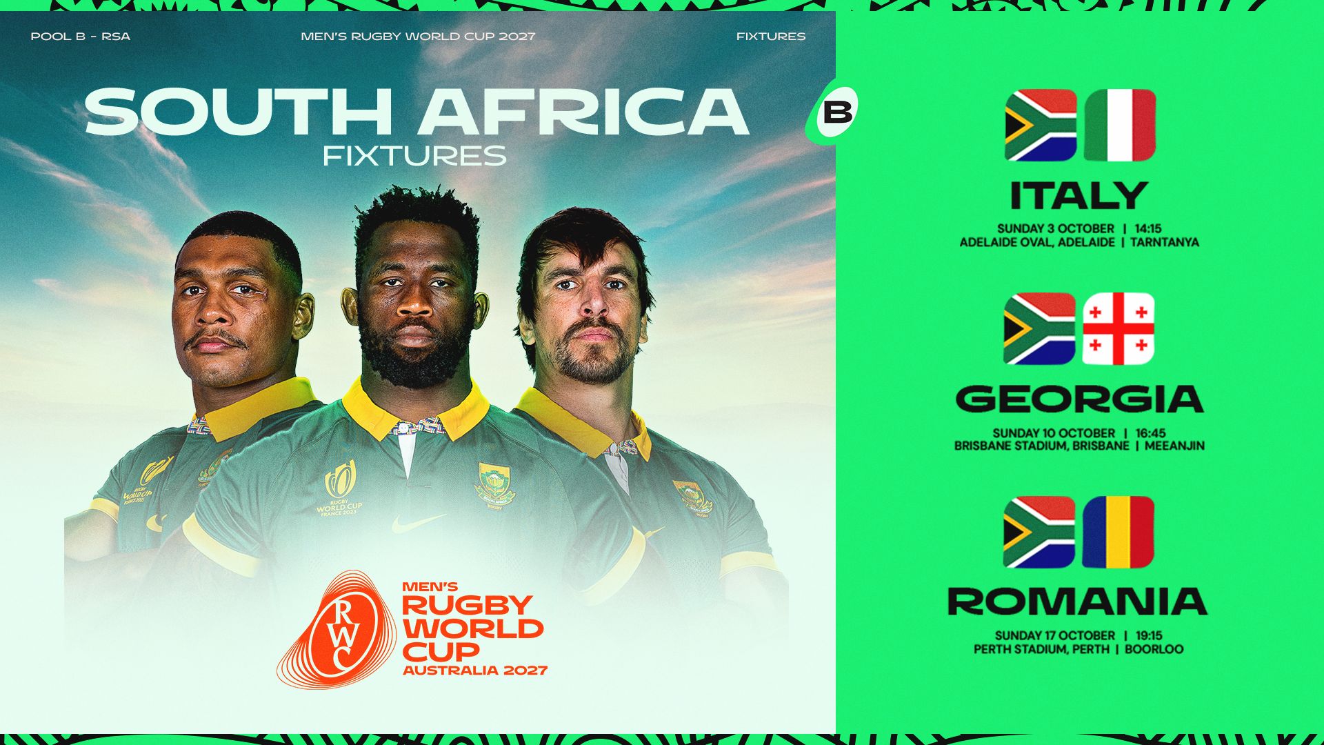 The Boks, who will have their sights set on trying to win their third successive RWC title, will line up against Italy in their opening match of the spectacle at the Adelaide Oval – where their only previous Test was against Australia in 2022 – at 05h45 (SA time) on Sunday 3 October, which will be followed by clashes against Georgia at the Brisbane Stadium on Sunday, 10 October (08h45), and Romania at Perth Stadium on Sunday, 17 October, (13h15).